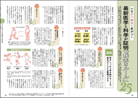例えば、歩くことは本当に体に良いのか、さらにはスピードやどれくらい歩けば良いのかなど、知りたかった疑問に"快答"。生活習慣のほか健康長寿につながる食べ物など、今日から生活に取り入れれば、数年後にはきっと差がつく長生きルールが満載です。