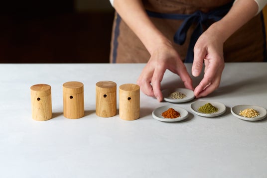 製造には、木を回転させながら削り出す「旋盤加工」を採用。 職人がひとつひとつ木の状態を見極めながら削り上げることで、茶筒のようにピタリと重なる高い精度を実現しました。蓋をスッと回して木目を合わせると、小さな口から七味がさらさらと出てくる、その一連の動作に愛おしさを感じる道具です。