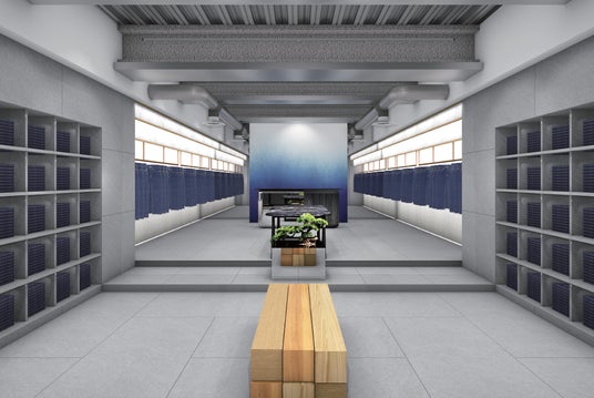 伝統的な厚手生地の縫製技術と革新的な織り、手仕事による加工技術を持つ岡山県、児島。同じインディゴブルーでありながら、職人の製作過程から生まれる独特な⻘さが、他に類を見ない存在感を生み出しています。大阪・福岡の両拠点では、ジーンズそのものが空間の「しつらえ」として機能する構成とし、天然素材や銀鏡加工、焼杉などを掛け合わせ、先進と伝統の調和を表現。不完全さや経年変化を取り入れ、侘び寂びと共鳴する世界観を体現しています。OSAKA は工場での制作過程を感じるような塗装仕上げ前の設備機器を設置、FUKUOKA では割れていくモルタル床を仕上げとするなど不完全な表現も随所に施しています。それは、経年劣化を楽しみ、そこに価値を見出すジーンズと侘び寂びに美を見出す日本文化の共通点を感じさせる店舗になっています。