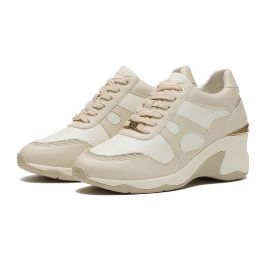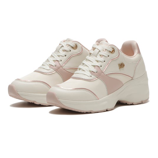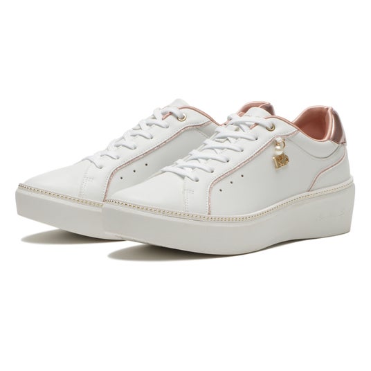 フェミニンなコーディネートにもピッタリのヒールアップスニーカー。ストーン付きのアイレットとシャイニー素材が華やかさを演出してくれます。