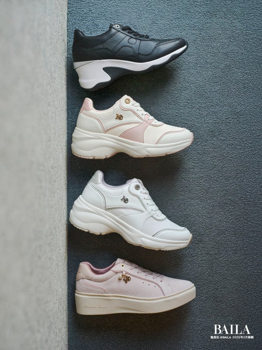 抜群の美脚効果、見た目とは裏腹の履き心地のヒールアップスニーカーが登場。グリッター素材やメタリックパーツをポイント使いして、大人っぽく仕上げました。見た目だけでなく、アーチを支えるインソールで安定感もあります。すっきりしたトゥー形状ですが、意外にゆったりデザイン。ミッドソールのサイドにアウトソールを深めに被せて、ヒールの形状を再現。底面はフェミニンさを演出しつつ、曲がりやグリップを考えたデザインにしています。