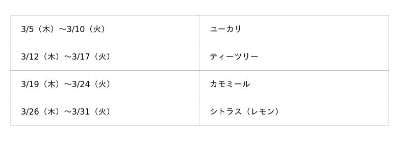 期間中、おふろcafe かりんの湯では春の時期に合わせて、サウナのセルフロウリュ用アロマとして ユーカリ/ティーツリー/カモミール/シトラス(レモン) の4種を使用します。