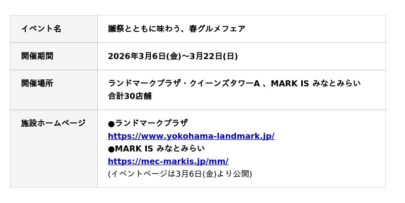 ランドマークプラザとMARK IS みなとみらい(神奈川県横浜市/運営:三菱地所プロパティマネジメント株式会社)では、国内外で人気の日本酒銘柄「獺祭」(山口県岩国市/株式会社 獺祭)とコラボレーションし、各店舗で「獺祭」と料理を楽しめる「獺祭とともに味わう、春グルメフェア」を、2026年3月6日(金)~3月22日(日)の期間限定で開催いたします。