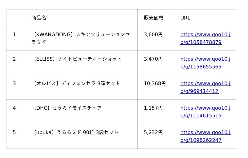 Qoo10 (https://www.qoo10.jp/) サイト上「セラミド」カテゴリーより販売個数に基づいたランキングです。