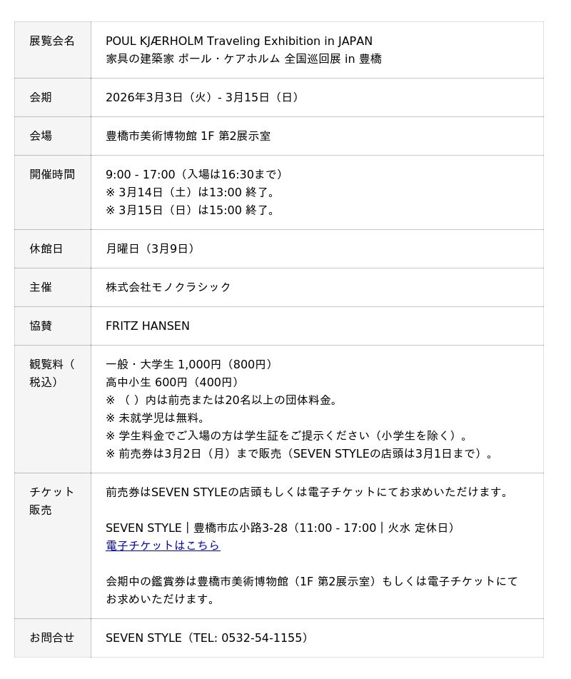 ハンセン)」協賛のもと、20世紀デンマークを代表する家具デザイナー「POUL KJÆRHOLM(以下、ポール・ケアホルム)」の展覧会を豊橋市美術博物館にて開催する運びとなりました。