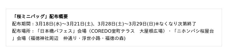 期間中、今年も日本橋の街中でオリジナルミニバッグを配布します。バッグの中にはイベントリーフレットやクーポンなど、SAKURA FES NIHONBASHI 2026を一層楽しめるグッズが盛りだくさん。桜ミニバッグを持ち歩いて、日本橋の街巡りを楽しみましょう。