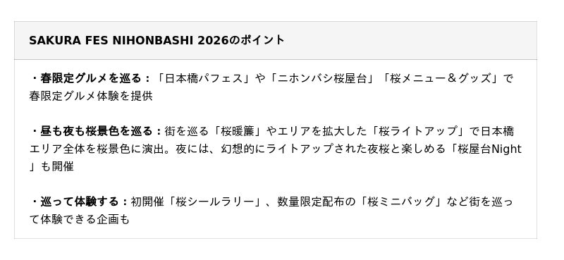 一般社団法人日本橋室町エリアマネジメントは、2026年3月18日(水)から4月5日(日)の期間、今年で13回目を迎える「SAKURA FES NIHONBASHI 2026」を開催いたします。