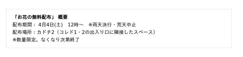 Instagramのイベント公式アカウントおよび、FLOVVERS公式の両アカウントをフォローしていただいた方限定で、お花の無料配布を行います。日本橋では、春を楽しむ来街者に向けて、インスタレーションや花の配布を通じて産地の花の魅力を身近に感じていただく取り組みを続けており、今年で3年目を迎えます。