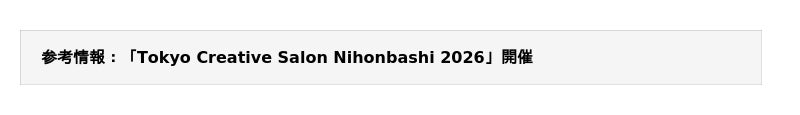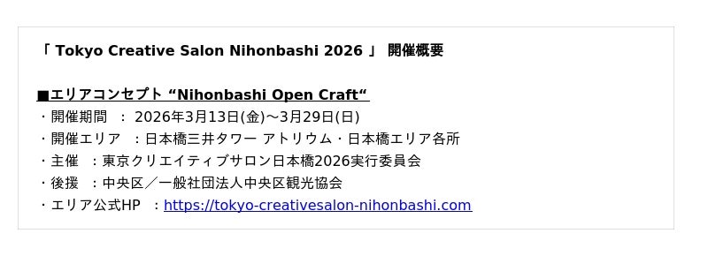 ※「Tokyo Creative Salon Nihonbashi 2026」の詳細については、以下よりプレスリリースをご参照ください。
