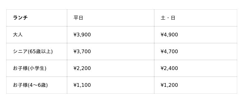 ランチ<平日>11:30a.m.~2:30p.m.<土日祝>11:30a.m.~3:30p.m.(120分制)