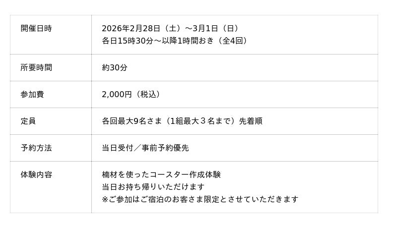 熱海・伊豆山 佳ら久(所在地:静岡県熱海市伊豆山、総支配人:辰巳哲一)は、江戸時代から続く熱海の伝統工芸「熱海楠細工」を体験できるワークショップを、2026年2 月28日(土)~3月1日(日)に開催いたします。職人の指導のもと、楠材の仕上げまでを体験することで、独特の香りと美しい木目を持つ伝統工芸の魅力に触れていただけます。