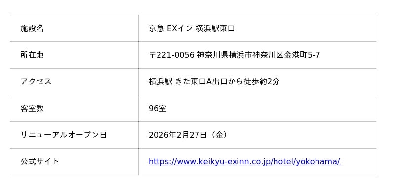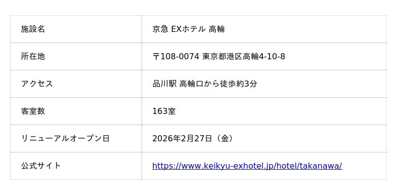 株式会社京急イーエックスイン(取締役社長:染崎 素洋)は、ビジネス・観光需要の高い品川駅・横浜駅エリアにおいて、「京急 EXホテル 高輪」および「京急 EXイン 横浜駅東口」を2026年2月27日(金)に同時リニューアルオープンいたします。