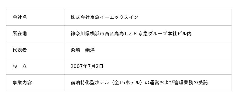 2007年設立。羽田空港や品川駅などのターミナル駅をはじめ、交通の利便性が高い立地に「京急 EXホテル / 京急 EXイン」の2つのブランドで宿泊特化型ホテルを15施設 展開しています。ホテルでは全室カードキーシステムを採用しているほか、シモンズ社と共同開発した最上の眠りを誘うオリジナルマットレスを導入(一部客室を除く)。利便性に富んだアクセスだけでなく、"上質のくつろぎ" と "安心できるサービス" を提供し、お客様に選ばれ、喜ばれるホテルを目指しています。