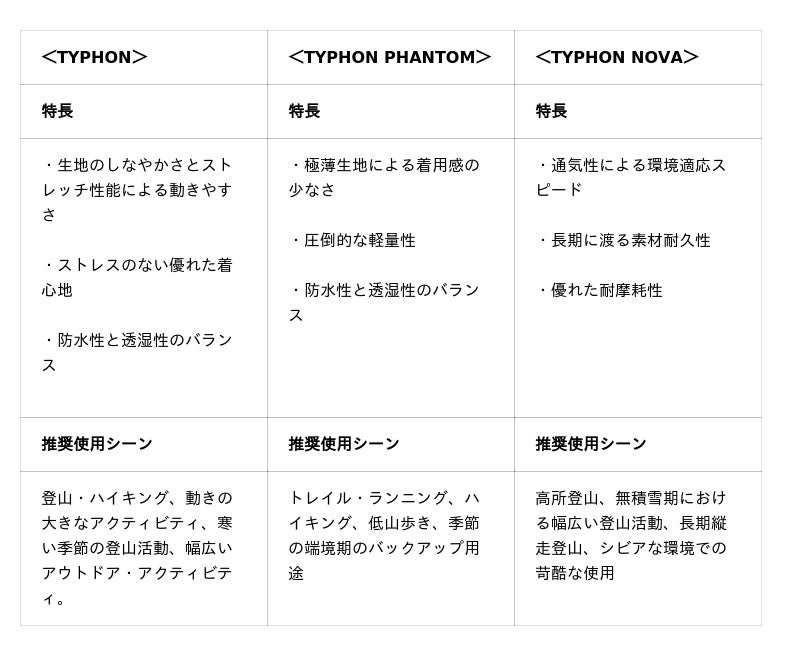 しなやかさを重視した「TYPHON」、超軽量を追求した「TYPHON PHANTOM」、そして通気性と耐久性を備えた次世代素材の「TYPHON NOVA」。それぞれのすぐれた特性が、アウトドア・アクティビティをより安全で快適なものへと導きます。
