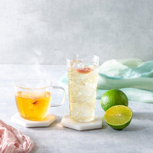 ROKU<六>ブロッサムブリーズ:宇治茶を漬け込んだROKU<六>に桜の香りを重ねた春の一杯。ライムと抹茶の甘みを軽やかなソーダがまとめ、桜花が花見の趣を添える上品な味わいです。