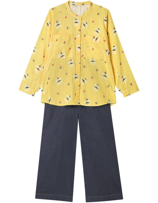 先染めの糸を使用したボトムは、デニム風に仕上げたスタイリッシュなデザイン。キャラクターのイメージに合わせたステッチカラーもポイントです。ウエストゴムを2本使用しているためおなかまわりをしめつけにくく、リラックスタイムの着用にもおすすめです。