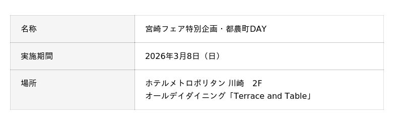ホテルメトロポリタン 川崎(運営/日本ホテル株式会社、総支配人/金田 文典)が直営するオールデイダイニング「Terrace and Table」では2026年1月15日より開催中の「宮崎フェア2026」の特別企画として、3月8日(日)限定で都農町の食の神髄を深掘りする「都農町DAY」を開催いたします。