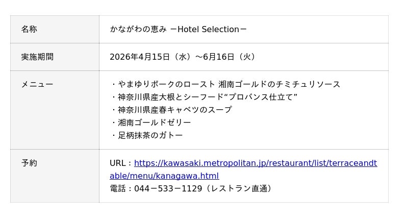 ホテルメトロポリタン 川崎(運営/日本ホテル株式会社、総支配人/金田 文典)が直営するオールデイダイニング「Terrace and Table」では2026年4月15日(水)~6月16日(火)の期間、神奈川県、横浜市、JRグループの共同による来年春(2027年4~6月)開催の神奈川・横浜デスティネーションキャンペーンに先立ち、今春の神奈川・横浜デスティネーションキャンペーン プレキャンペーンに併せて、「かながわの恵み-Hotel Selection-(以下、かながわの恵み)」を開催いたします。