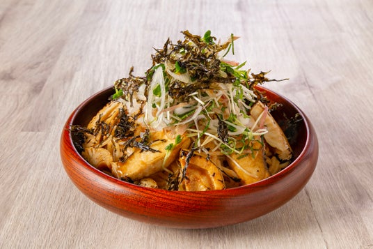 旬の筍と真鯛を醤油で香ばしく炒め、壁の穴の人気商品「明太子スパゲッティ」にトッピングしました季節限定メニューでございます。鬼おろしと香味野菜でさっぱりと仕上げました。