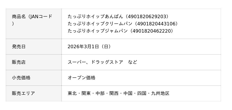 敷島製パン株式会社(Pasco)は「たっぷりホイップあんぱん」「たっぷりホイップクリームパン」「たっぷりホイップジャムパン」を、2026年3月1日(日)より東北・関東・中部・関西・中国・四国・九州地区にてリニューアル発売します。