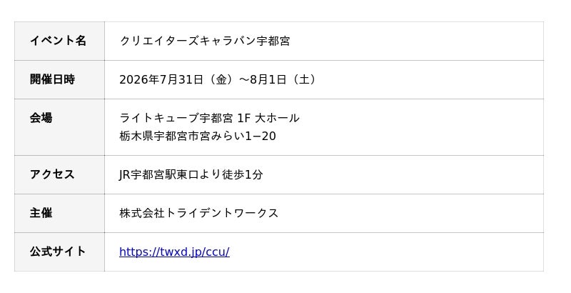 クリエイターもエンタメ企業もみんなで楽しむキタカントー最大級のエンタメの祭典『クリエイターズキャラバン宇都宮』、7月31日(金)、8月1日(土)開催決定!