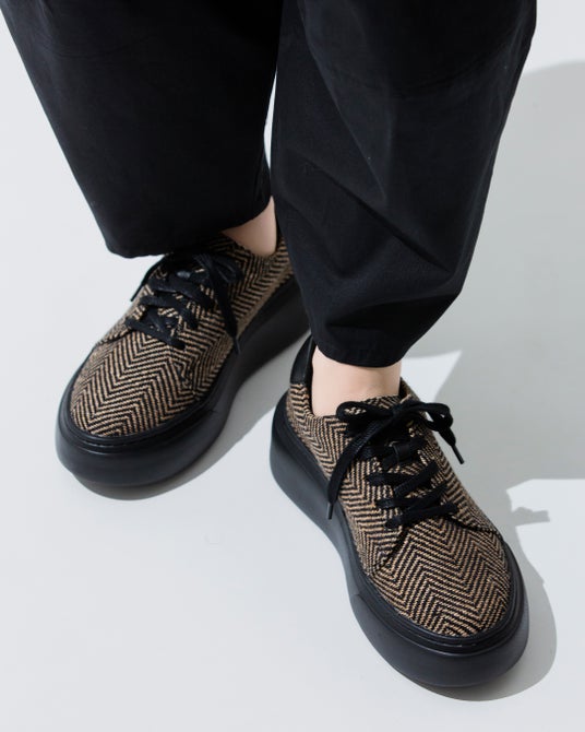 天然素材であるジュートを緻密なヘリンボーン柄に編み上げたこのモデルは、ブラックの落ち着きの中に独特の個性を添える一足です。レザーとは異なる軽やかな質感が、春夏のスタイリングに豊かな表情を与えます。