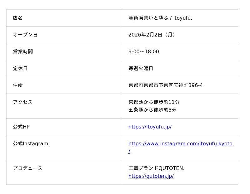 京都・下京区に新たな文化拠点。工藝ブランドQUTOTEN.がプロデュースする「藝術喫茶いとゆふ」2026年2月2日オープン