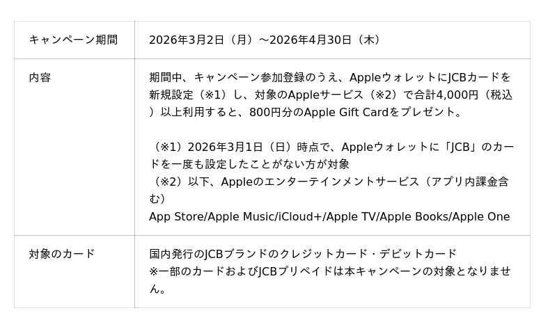 株式会社ジェーシービー (本社:東京都港区、代表取締役会長 兼 執行役員社長:二重 孝好、以下:JCB)は、2026年3月2日(月)から2026年4月30日(木)まで、「JCBカードでApple Payをはじめよう!Apple Gift Cardプレゼントキャンペーン」を実施します。