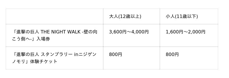 ※「進撃の巨人 THE NIGHT WALK -壁の向こう側へ-」については4歳以下無料