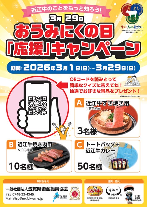 滋賀県畜産振興協会は、「近江牛」生産・流通推進協議会、近江肉牛協会、滋賀県食肉三水会の協力のもと、2026年2月1日から3月31日まで、近江牛1万円分の引換券が当たる「おうみにくの日」キャンペーンを実施しています。このキャンペーンは、近江牛の伝統と高品質が国に認められたGIマークを消費者の皆さまに広く知っていただき、より多くの方に近江牛を賞味していただくことを目的としています。