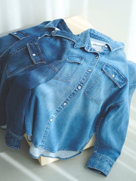 Healthy Denimの定番ビッグシャツをベースに、着丈や袖のバランスを調整。抜け感はそのままに、より着こなしやすいシルエットへとアップデート。パンツ同様に、やわらかな再生繊維をブレンドした特別なデニム素材を採用。