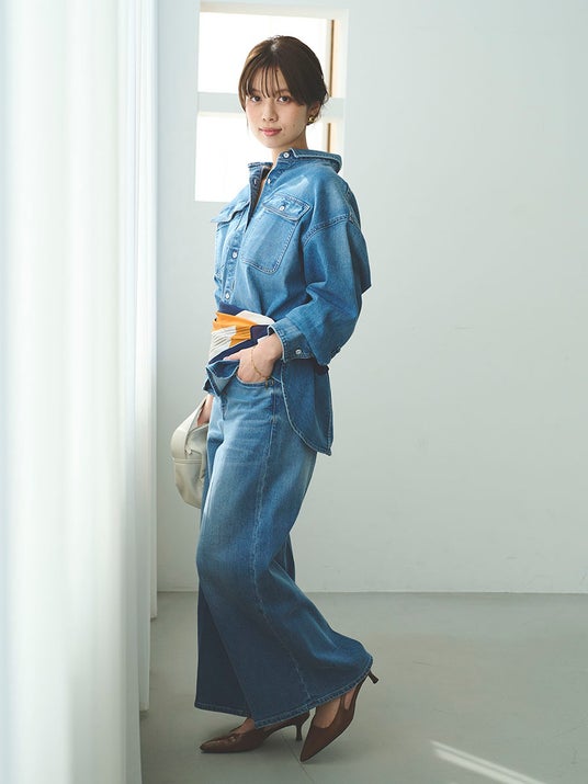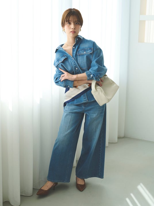 コットンにやわらかな再生繊維をブレンドした特別なデニム素材を使用。しなやかな落ち感と上品さを備え、環境に配慮した生産背景と快適な着心地も魅力です。