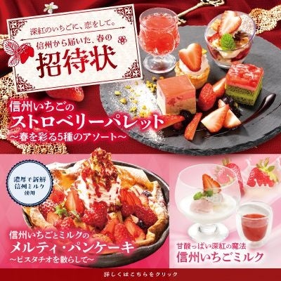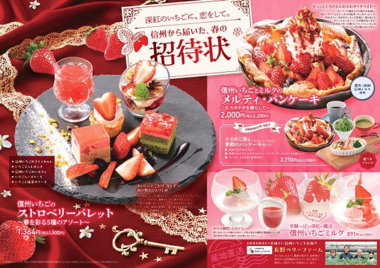 A. 「深紅のいちごに、恋をして。」という言葉の通り、一口食べれば心ときめくような、甘酸っぱい深紅の魔法 を準備してお待ちしております。フレッシュな信州いちごと濃厚なミルクが織りなす極上のスイーツで、春の訪れを存分にお楽しみください。