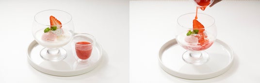 お客様ご自身でいちごソースをかけて仕上げていただく、エンターテインメント性あふれる一杯です。真っ白なミルクが鮮やかなピンク色に染まる瞬間は、まさに「動画映え」間違いなし 。混ぜ具合によって変わる味わいの変化も、ぜひお楽しみください 。