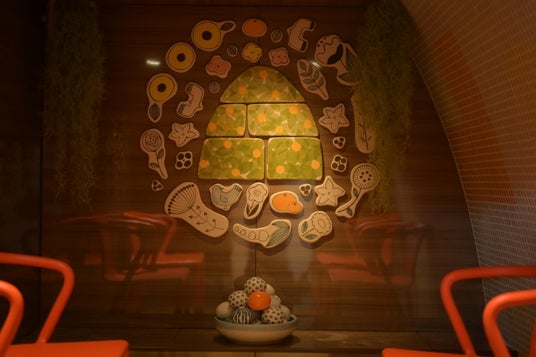 みかんサウナ(女性): 今治の島をかたどった外観に、伝統工芸「砥部焼」を装飾した愛媛らしいサウナです。