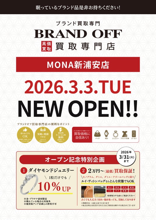 店舗名 :ブランド買取専門店 BRAND OFF MONA新浦安店グランドオープン日 :2026年3月3日(火)