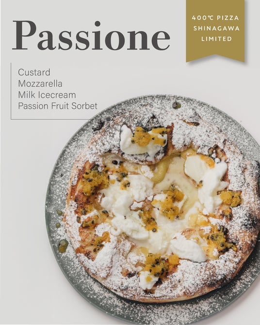 ピッツァは前半と後半で入れ替え予定です。前半は品川店限定デザートピッツァ「パッシオーネ」。後半の1皿は、公式Instagramにてお知らせします。