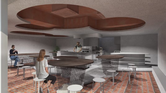 テーブルは、ひとつひとつが独立しながらも、全体としてゆるやかにつながる配置に。しまなみ海道の島々のように、それぞれの席が個性を持ちながらも一体感のある空間に仕上げました。さらに、視線が自然と抜けるレイアウトにすることで、瀬戸内のスカイラインのように広がる"パノラマ"を表現。奥行きのある構成により、にぎわいと落ち着きが共存する空間を目指しました。