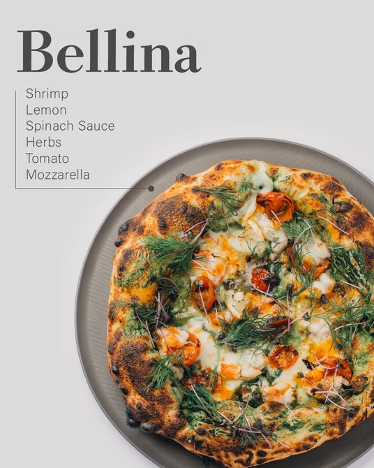 ベリーナ(Bellina)エビ、レモン、ほうれん草ソース、ハーブ、トマト、モッツァレラ