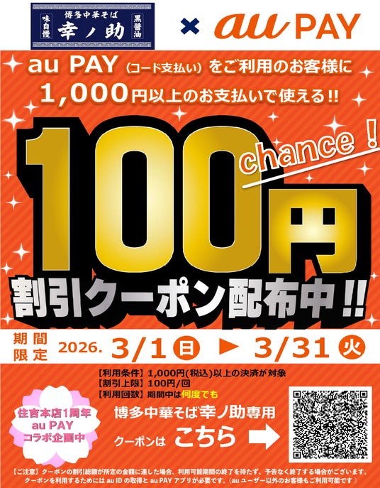 世界10カ国90店舗以上を展開、ラーメンのグローバルブランド、博多一幸舎や幸ちゃんラーメンを運営する、株式会社ウインズジャパンホールディングス(所在地 福岡県福岡市博多区、代表取締役社長 吉村 幸助 以下当社)は、博多一幸舎 博多駅筑紫口店・ドライブイン一幸舎 空港店・幸ちゃんラーメン イオンモール倉敷店・博多中華そば 幸ノ助 住吉本店の4店舗でKDDI(株)でスマートフォン決済サービス「au PAY」のご利用で使える割引クーポンを、ただいま配布しております。ラーメンなどがお得に食べられる機会となっておりますので、この機会にぜひ、皆様お誘いあわせの上お越しください。