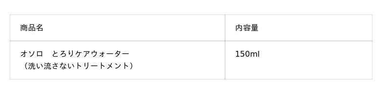 こうした背景を受け、「Osolo(オソロ)」は、パサつく大人の髪も、繊細な子どもの髪も使いやすいアウトバストリートメントとして、『オソロ とろりケアウォーター』を発売します。うるおい美髪成分*1、天然由来成分*2 配合でとろりとした美髪ウォーターが浸透。触れ心地やわらかな、うるさら髪がつづきます。