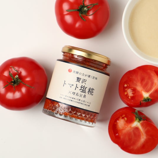 「贅沢トマト塩糀×理系兄弟」は、山梨県のトマト農家「ヨダファーム」と、福島県の老舗酒蔵「有賀醸造」とともに共同開発した、トマトと塩糀の調味料です。最大の特徴は、1瓶に約10個分もの完熟トマトを独自の製法で濃縮している点にあります。トマト本来の力強い旨味と、日本酒「理系兄弟」の技術を活かした糀の甘みが融合しました。ひと匙で料理の旨味を底上げする、素材の濃さにこだわった一品です。