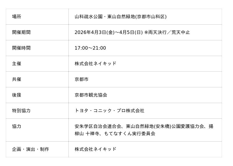 株式会社ネイキッド(英語表記:NAKED, INC.)は、京都市と連携し、京都市山科区誕生50周年を記念した夜桜ライトアップイベント『NAKED 夜さんぽ -京都・山科-』を2026年4月3日(金)から4月5日(日)の3日間、山科疏水公園及び東山自然緑地にて開催いたします。