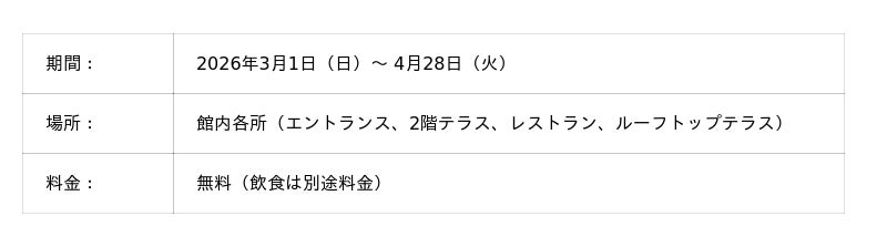 エントランス、2階テラス、レストラン、そしてルーフトップテラスまで、ホテル全体で桜を楽しめる回遊型の春体験をご提供いたします。