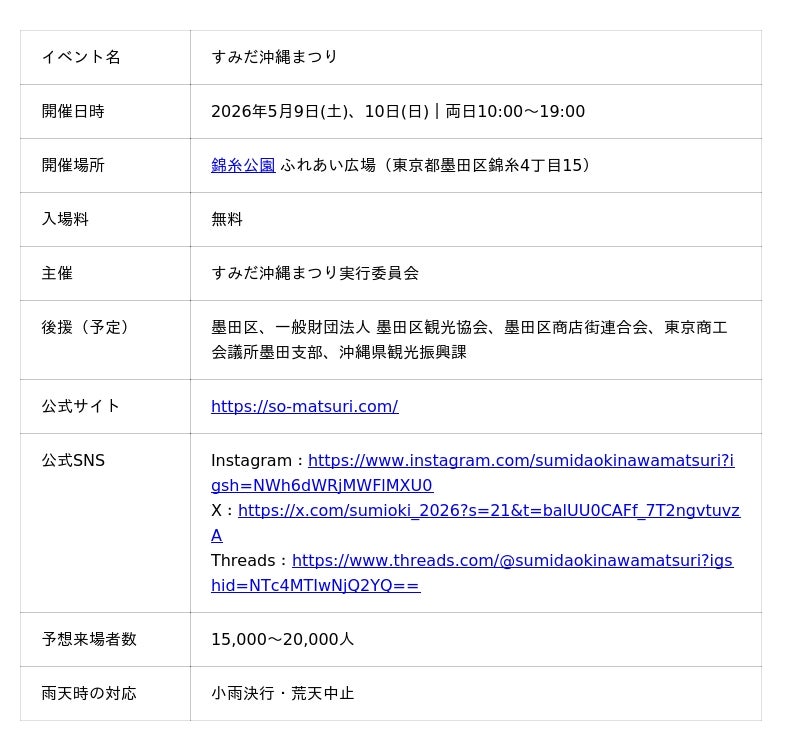 すみだ沖縄まつり実行委員会(本部:東京都墨田区、委員長:添田望)は、2026年5月9日(土)・10日(日)の2日間、墨田区・錦糸公園にて「すみだ沖縄まつり」を初開催いたします 。 本イベントは、「すみだで出会う、もうひとつの沖縄」をコンセプトに、墨田区と沖縄県それぞれの食・文化・音楽・工芸の魅力を発信し、地域間交流と観光・産業振興につなげることを目的としています 。2日間で約15,000~20,000名の来場を見込んでおり、本日より本イベントの趣旨にご賛同いただける協賛パートナー企業の募集を開始いたしました 。