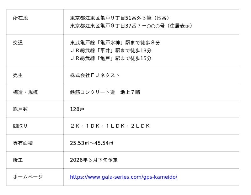 株式会社FJネクストホールディングス(本社:東京都新宿区 代表取締役社長 肥田 恵輔 証券コード:8935)の100%子会社である、株式会社FJネクスト(本社:東京都新宿区 代表取締役社長 肥田 幸春)は、分譲マンション「ガーラ・パークサイド亀戸」(総戸数128戸)の販売[申込受付]を3月6日(金)より開始いたします。