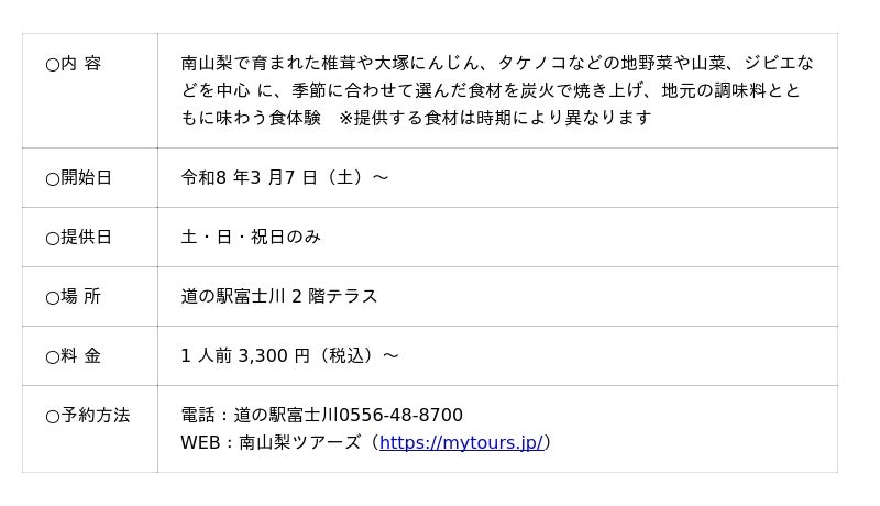 この度、「南山梨」エリアの豊かな自然が育んだ"山の幸"を堪能できるコンテンツとして、直火でキノコやジビエなどの食材を焼き上げ、地域ならではの調味料とともに味わう新しい食体験「ヤマ焼き」を開発し、3月7日(土)より提供を開始します。