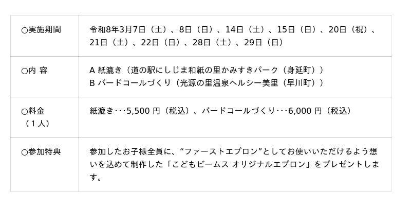 また、本プロジェクトの一環として、ビームスのキッズ向けレーベル「こども ビームス」が監修する、ファミリー層向け体験プログラムも期間限定で実施します。紙漉き体験やバードコール(鳥笛)づくりなど、南山梨の自然・文化を親子で学べる内容となっています。