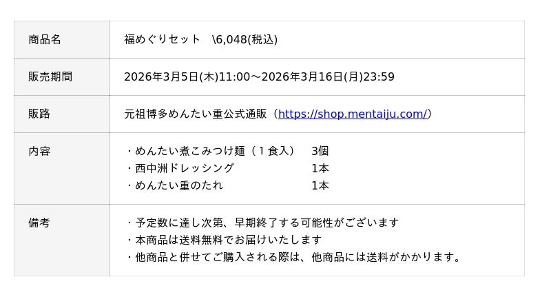 元祖博多めんたい重は、2026年3月5日(木)から「福めぐりセット」を公式通販限定で販売開始いたします。