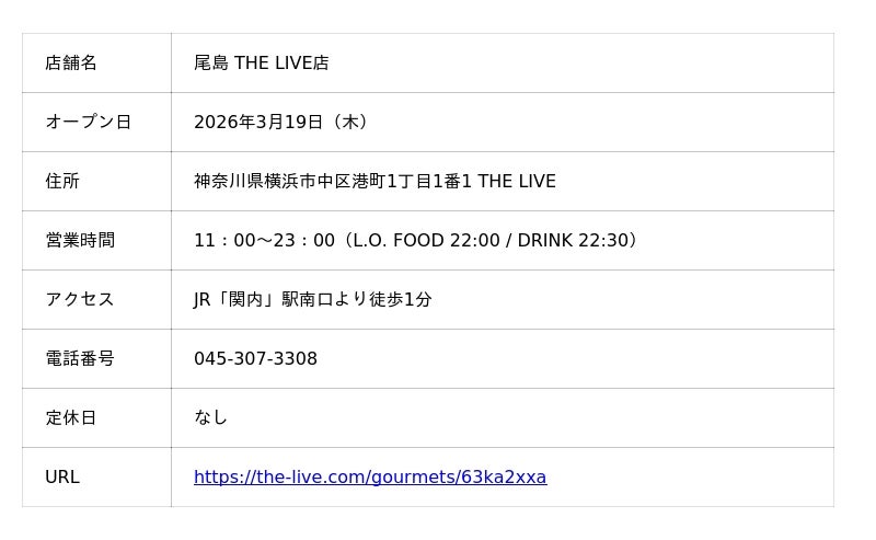 株式会社尾島商店(本社:神奈川県横浜市、代表取締役:尾島隆一)は、2026年3月19日(木)、JR関内駅前の新ランドマーク「BASEGATE横浜関内」のグランドオープンに合わせ、同施設内のライブビューイングアリーナ『THE LIVE Supported by 大和地所』に、「尾島 THE LIVE店」をオープンいたします。